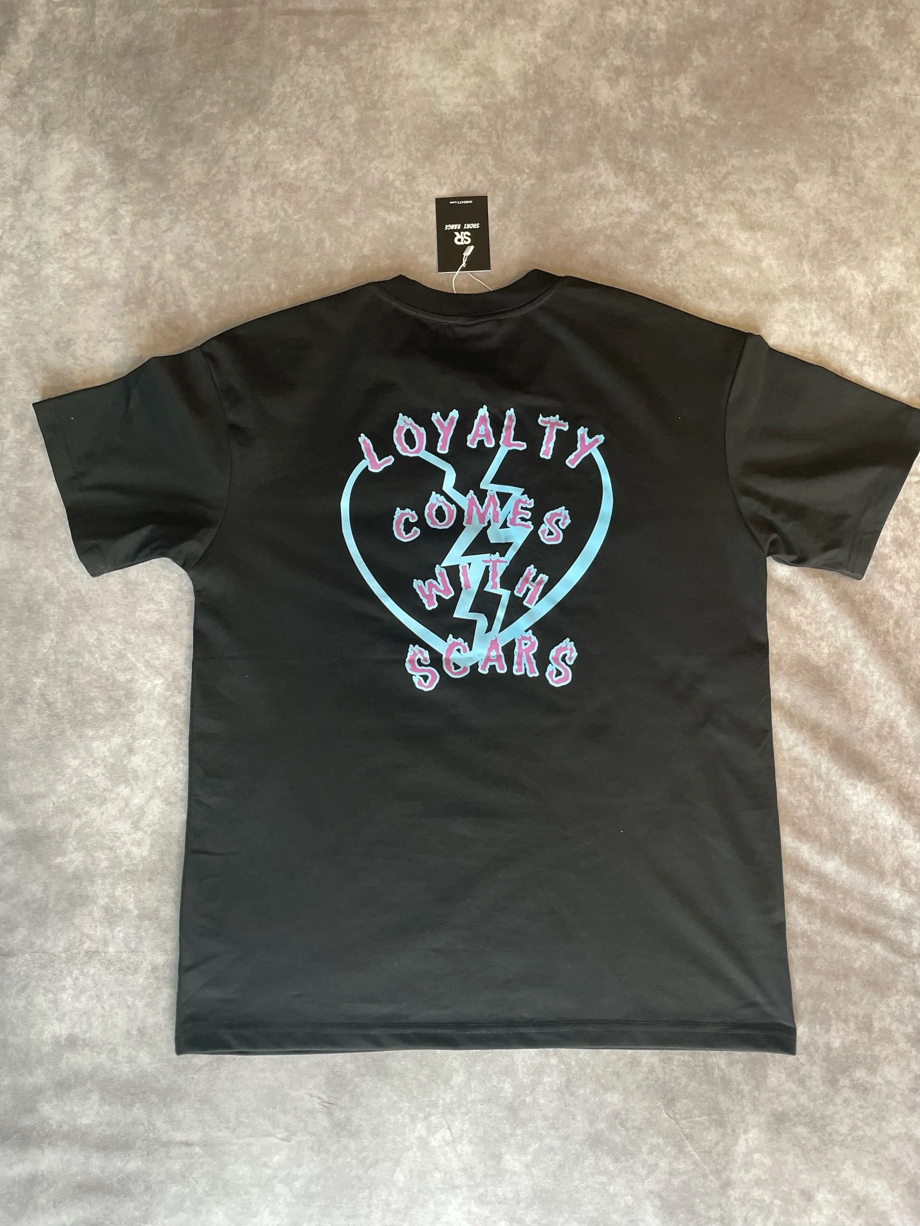 Shop › Short Range “Loyalty Comes With Scars” T-Shirt (Black/Blue/Purple) Image 1 of 2 Image 2 of 2 Short Range “Loyalty Comes With Scars” T-Shirt (Black/Blue/Purple) $30.00 Short Range written on the chest.Loyalty comes with scars design on the back.Black/blue/purpleTrue to size Size: Small Medium Large X-Large Add To Cart Added! Short Range written on the chest.Loyalty comes with scars design on the back.Black/blue/purpleTrue to size